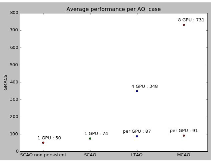 Looking at these results in terms of giga multiply-accumulate per second (GMAC/s), a better performance per GPU is obtained in the LTAO and MCAO case as compared to SCAO. Indeed, the LTAO case is 6 times larger in terms of number of operations than the SCAO case for a single MVM, which is again doubled in the case of a pseudo-open loop pipeline and is addressed with 4 GPUs. We would thus expect an average execution time 3 times larger, but the histogram shows that the pipeline is only 2.6 times slower. The amount of computations done by a single GPU is thus larger in the case of LTAO and allows to leverage more of the GPU memory bandwidth. In the case of MCAO, the problem scale is 3 times larger than in the LTAO case and is addressed by 8 GPUs,