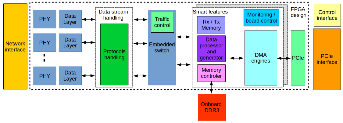 One objective of this axis of development is to provide a COTS NIC solution, based on the FPGA technology, with smart features, compatible with existing high performance switch solutions, based on standard serial protocols (TCP/UDP through 10G Ethernet and 40G Infiniband), and supported in mainstream non proprietary middleware. (obj. 1.2)