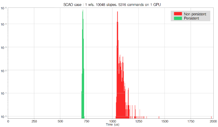 The obtained results show that extreme stability and maximum performance can be achieved when removing kernel launches and executing a single pipeline. In the histogram below, we have evaluated the performance of our pipeline (MVM only) on a V100 GPU using persistent kernels.