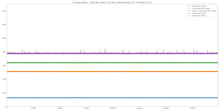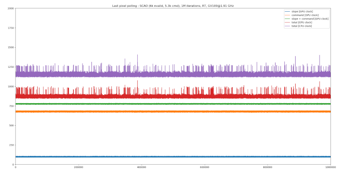 On top of this, while the total time as seen from the GPU clocks is equal to the total time as seen from the host CPU process is equal in the case of the V100 it is significantly different in the case of the GV100. This seems to show that the actual clock frequency on the Tesla line of the product can be well handled, it is not the case for other lines of products and in particular for the Quadro, which evidence an important property of the GPU for real-time applications.